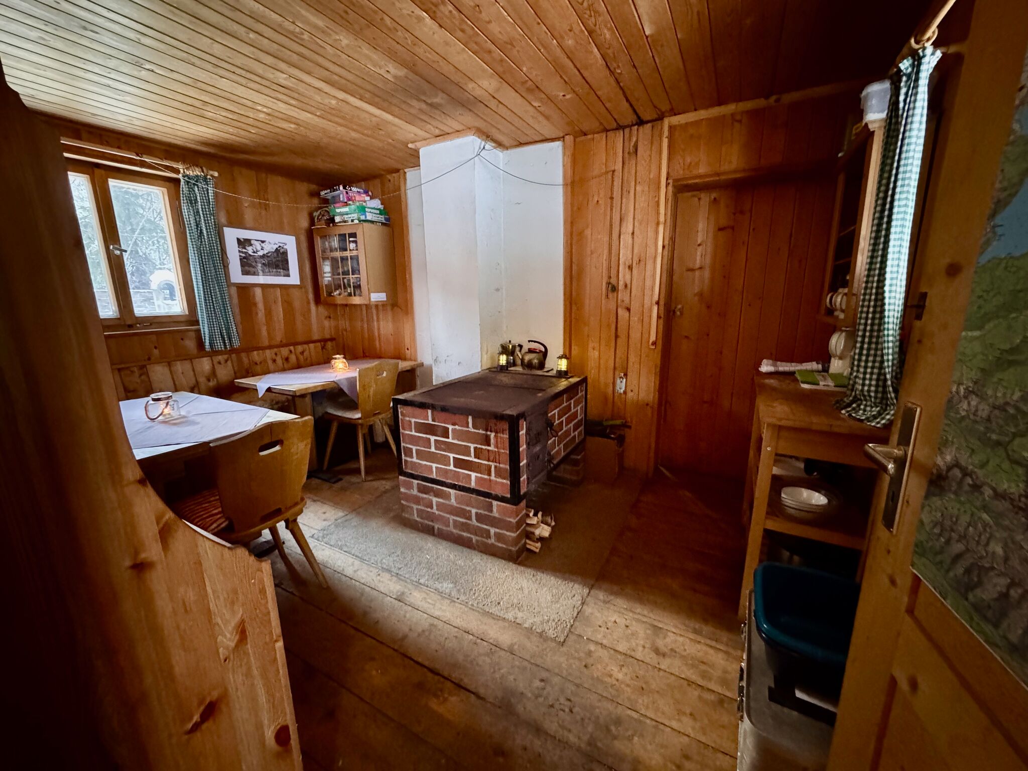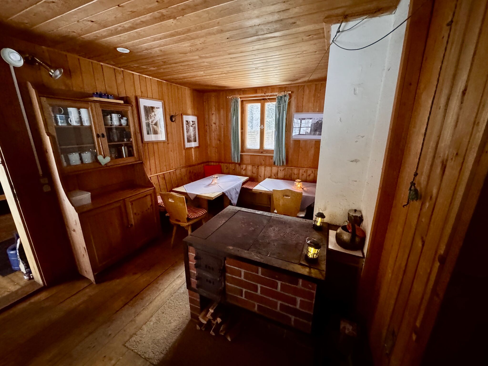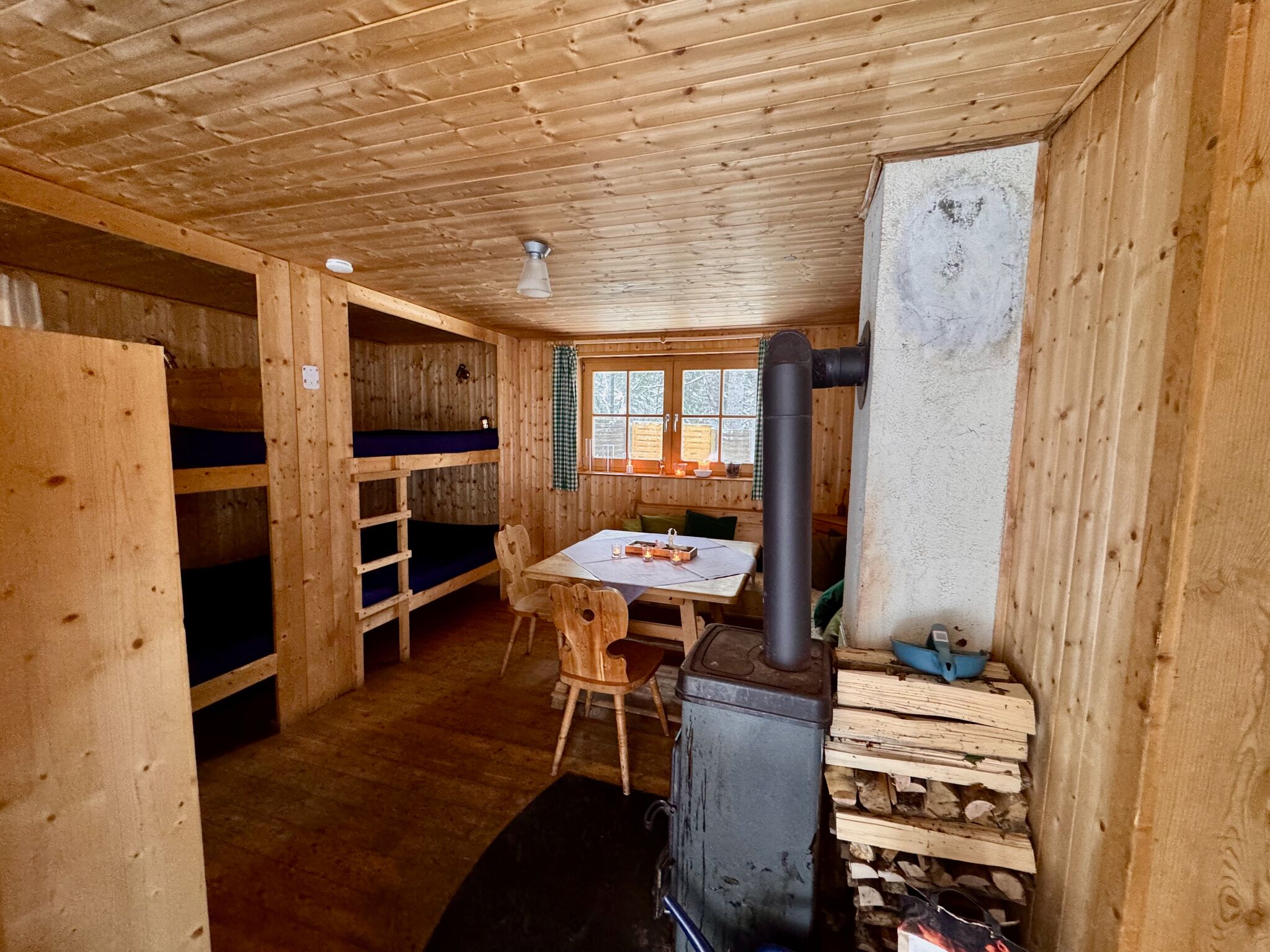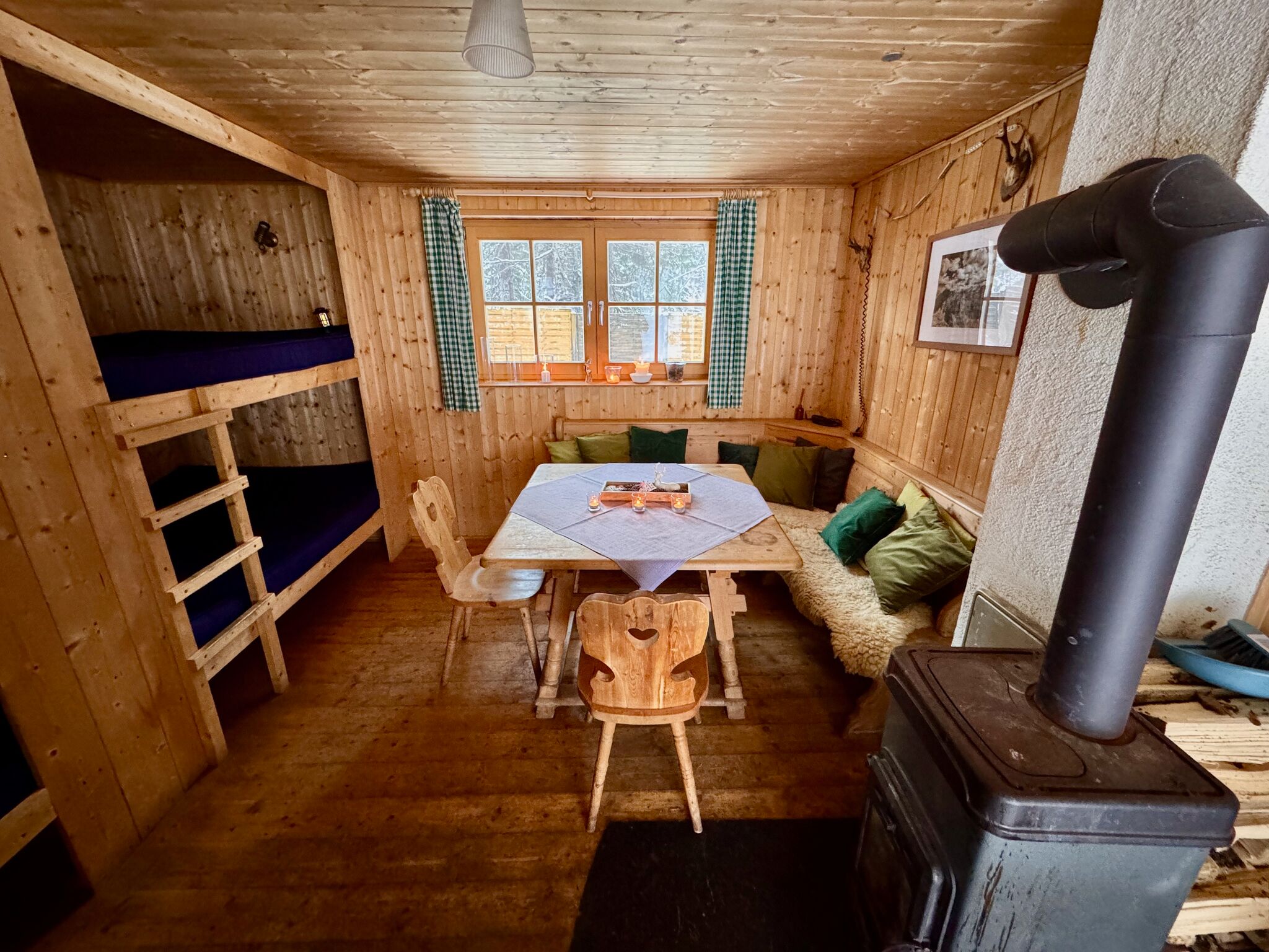 Eine Wohnküche mit Holzherd bildet das Herz der Hütte. Daneben gibt es eine gemütliche Wohnstube, in der sich zwei Doppelstockbetten mit Schlafplätzen für bis zu acht Personen befinden. Ein zusätzliches Schlafzimmer mit zwei Stockbetten bietet Platz für weitere vier Personen.