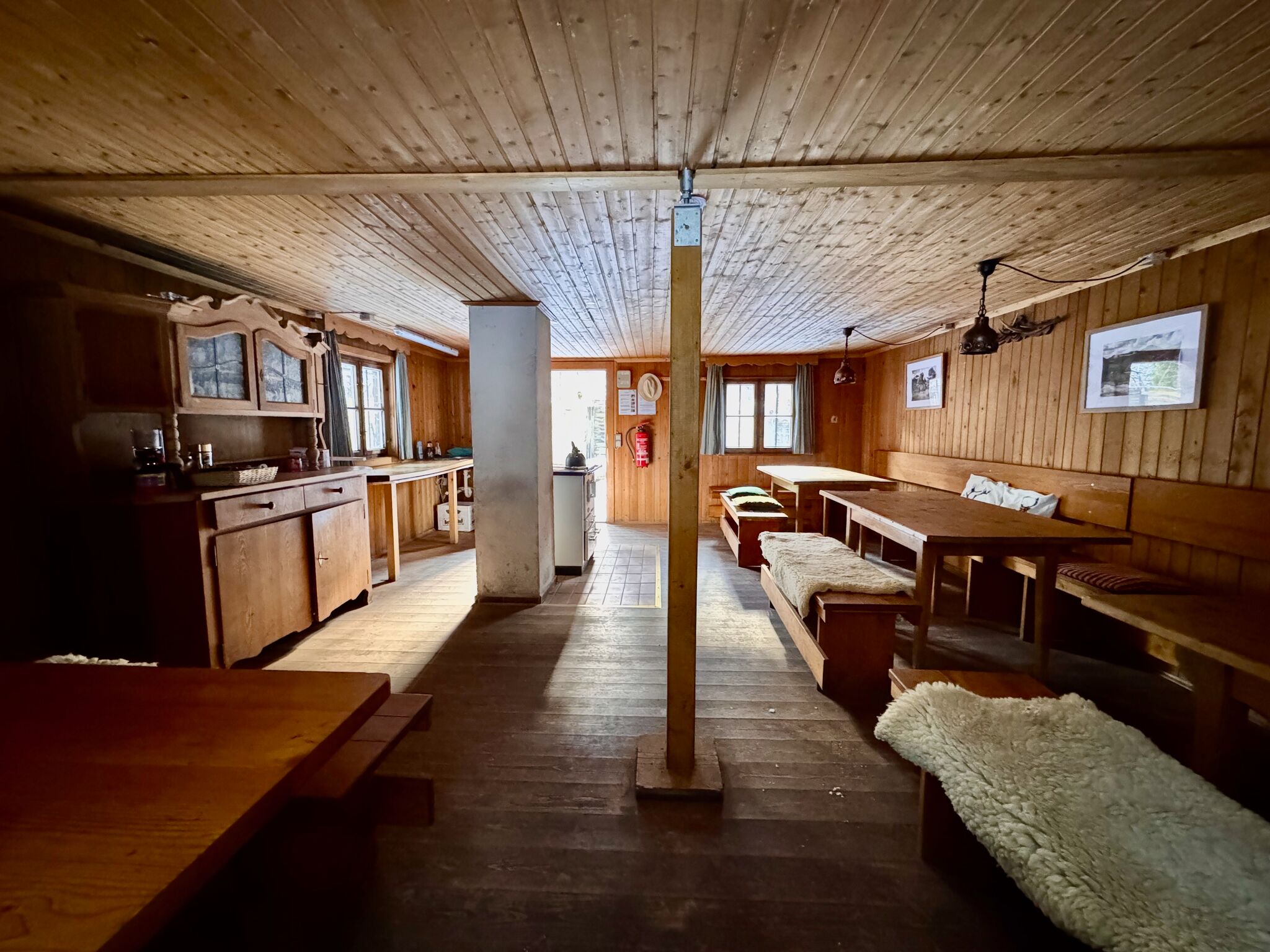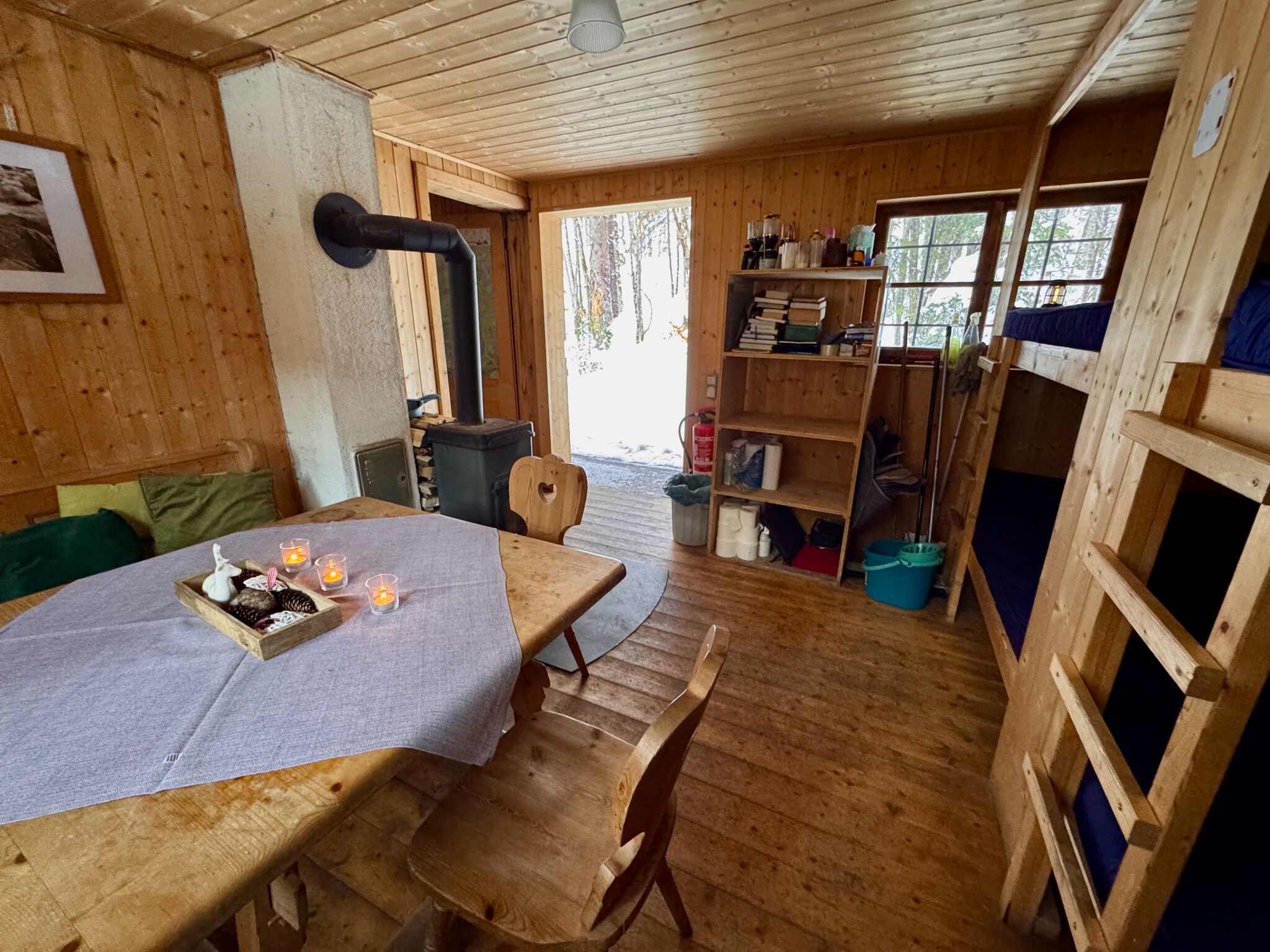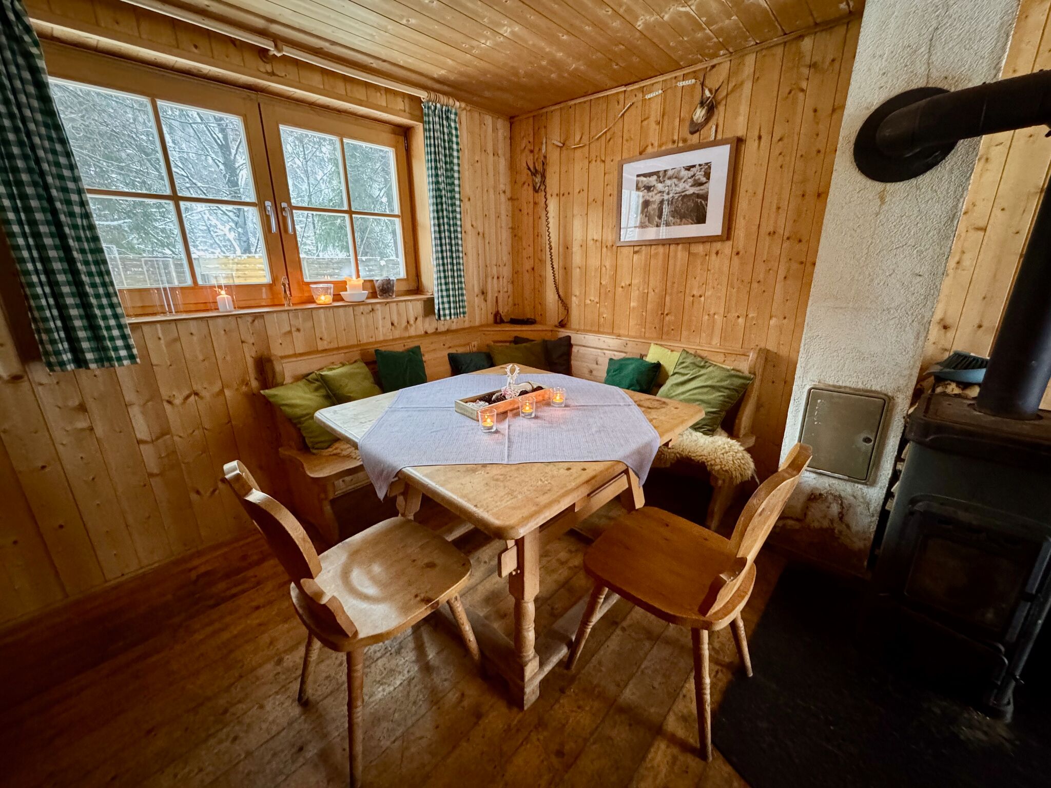 Eine Wohnküche mit Holzherd bildet das Herz der Hütte. Daneben gibt es eine gemütliche Wohnstube, in der sich zwei Doppelstockbetten mit Schlafplätzen für bis zu acht Personen befinden. Ein zusätzliches Schlafzimmer mit zwei Stockbetten bietet Platz für weitere vier Personen.