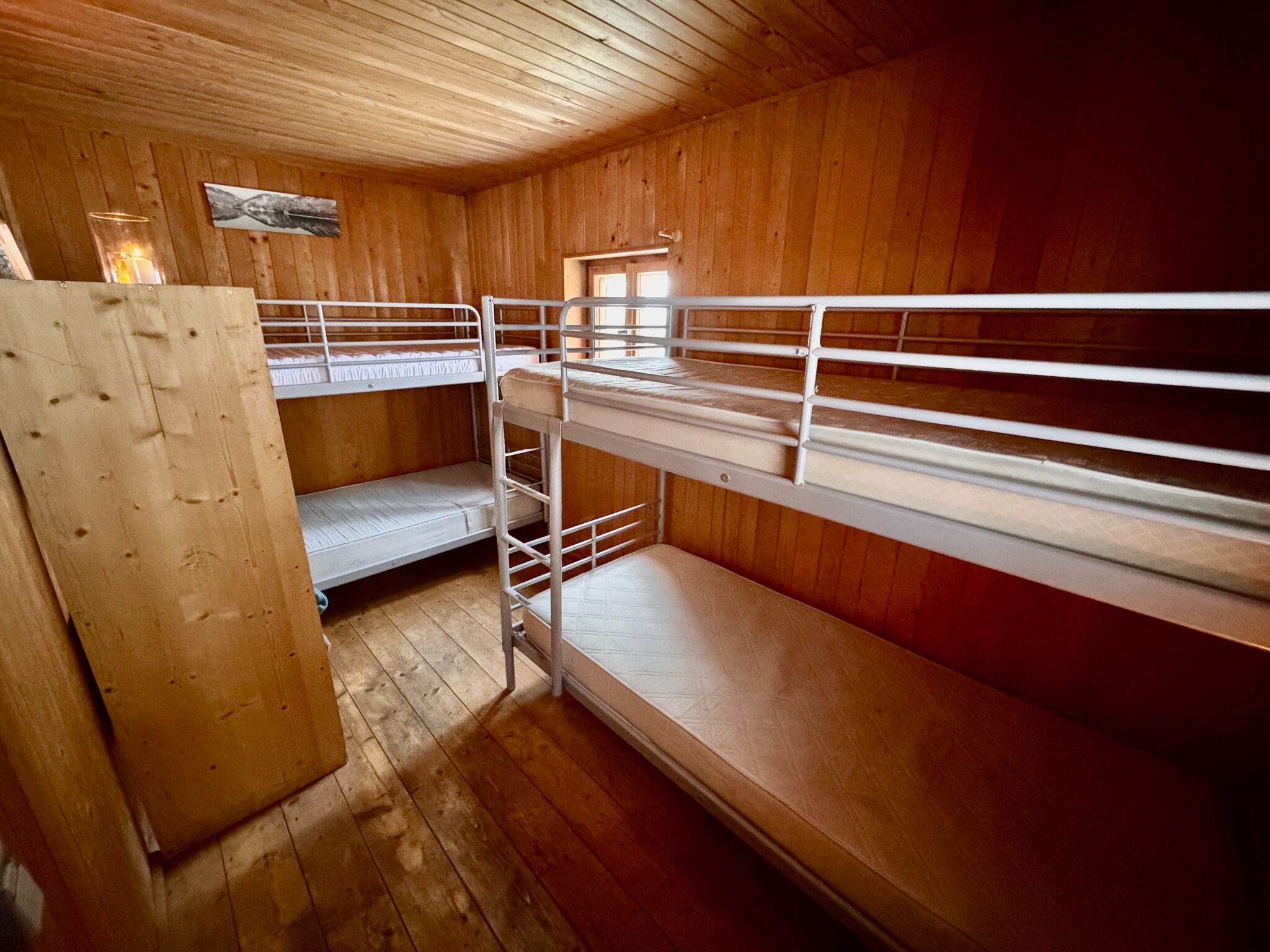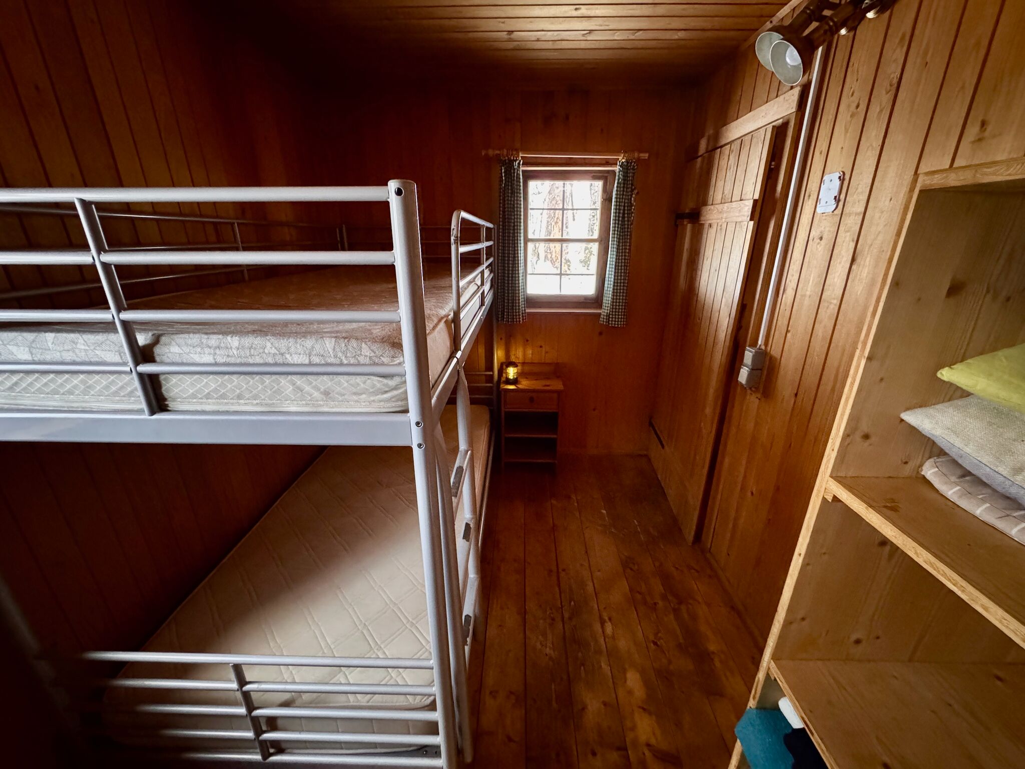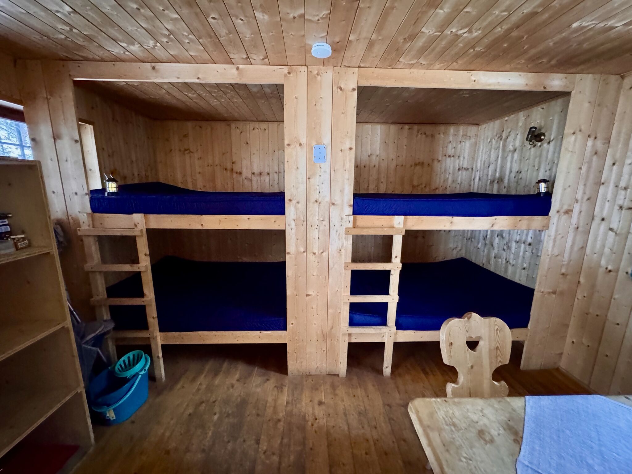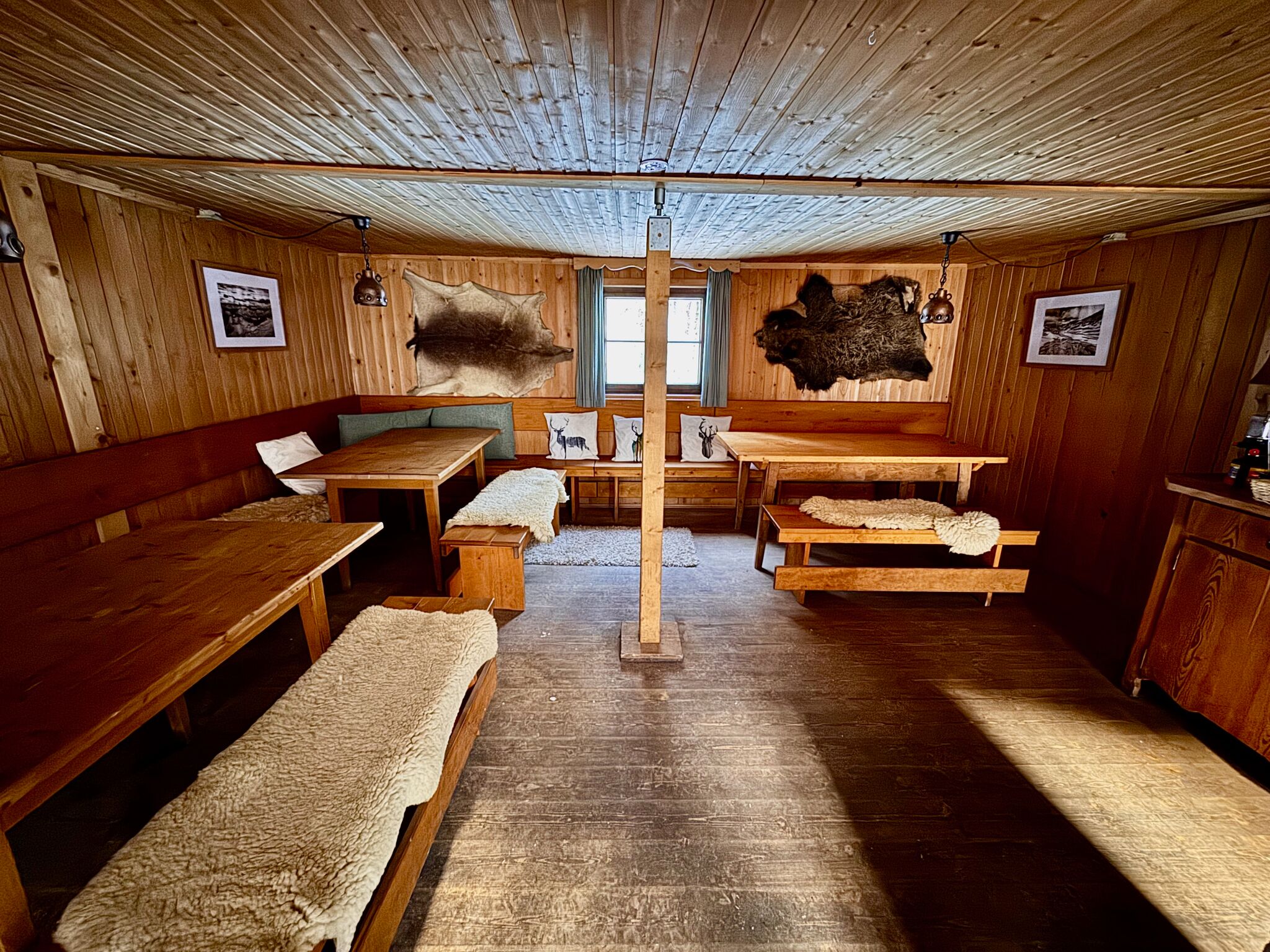 Eine Wohnküche mit Holzherd bildet das Herz der Hütte. Daneben gibt es eine gemütliche Wohnstube, in der sich zwei Doppelstockbetten mit Schlafplätzen für bis zu acht Personen befinden. Ein zusätzliches Schlafzimmer mit zwei Stockbetten bietet Platz für weitere vier Personen.