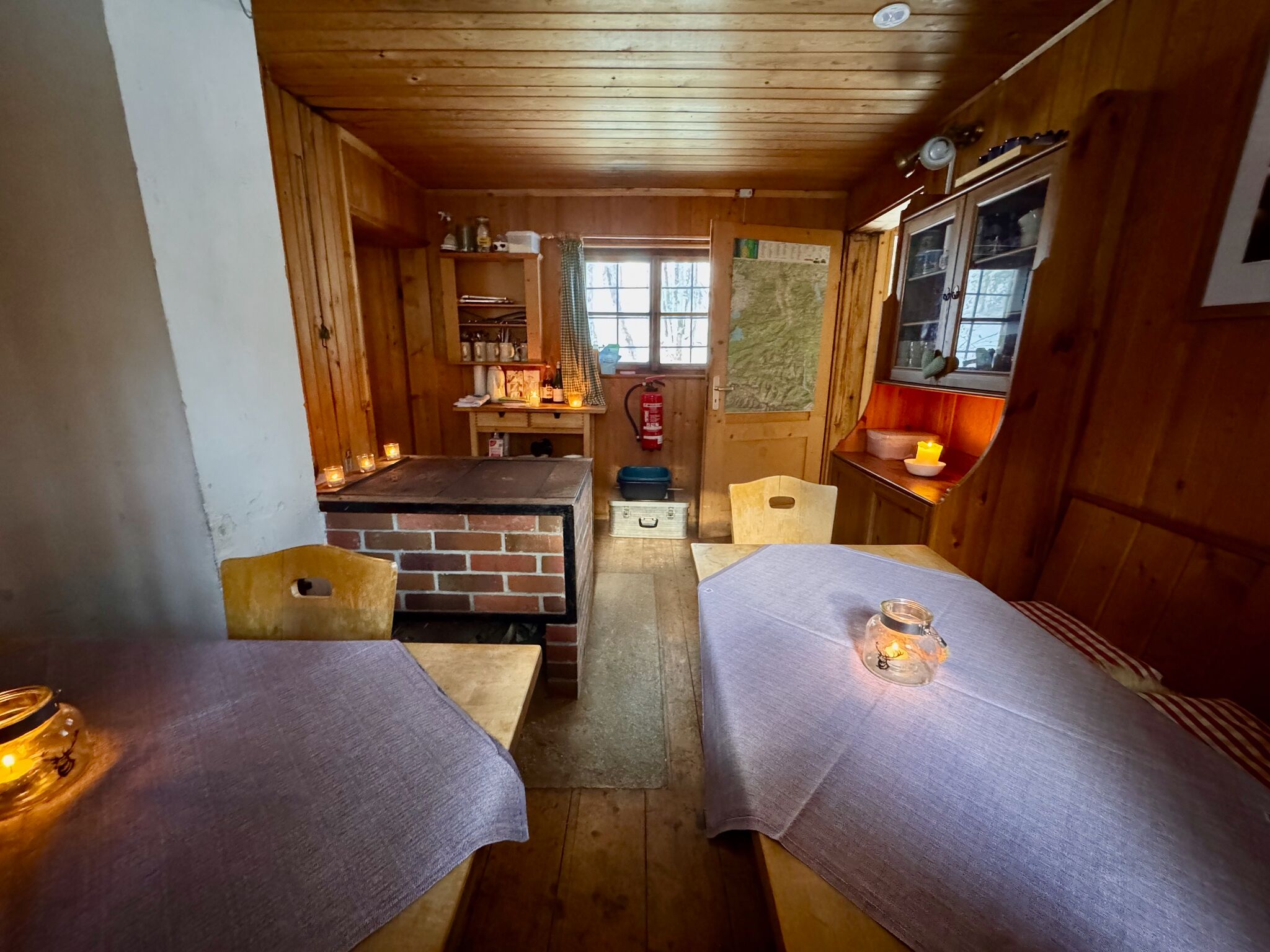 Es gibt keinen Stromanschluss. Akkubetriebene Lampen sowie eine Powerbank stehen zur Verfügung, zusätzlich sorgen Kerzen für stimmungsvolles Licht.
